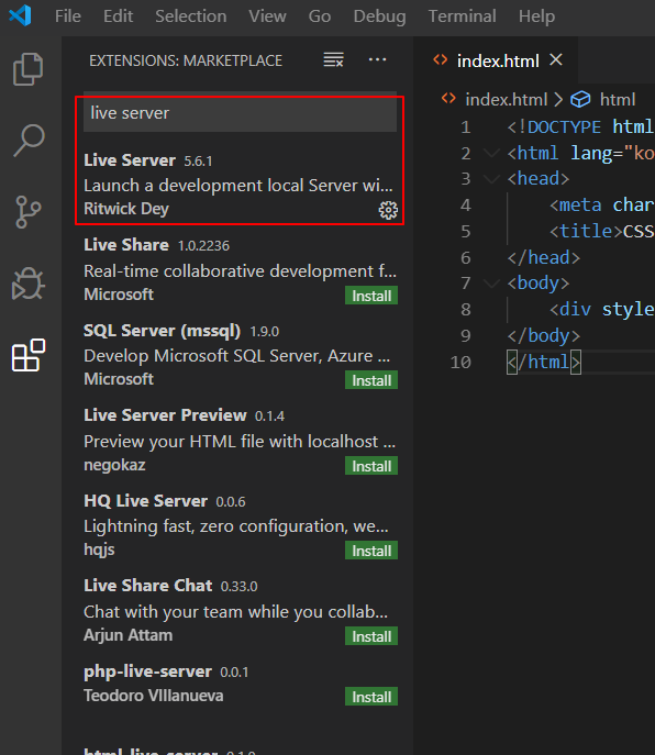 live server를 검색해 준 후 install을 눌러 설치해줍니다.