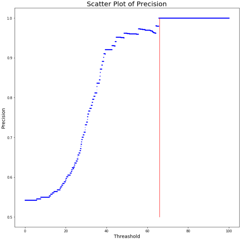 산점도를 보면 임계치가 올라가는데 정밀도는 떨어지는 구간들이 있다.