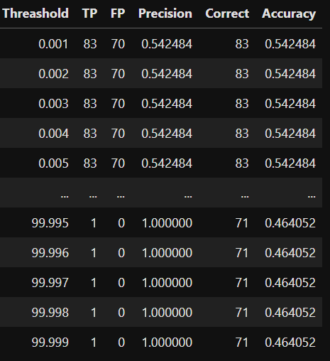 df_final.columns = ["Threashold","TP","FP","Precision","Correct","Accuracy"]