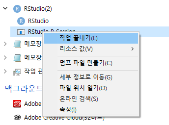 3. ctrl + shift + esc 로 작업관리자를 열어 RStudio R Session을 찾습니다.
