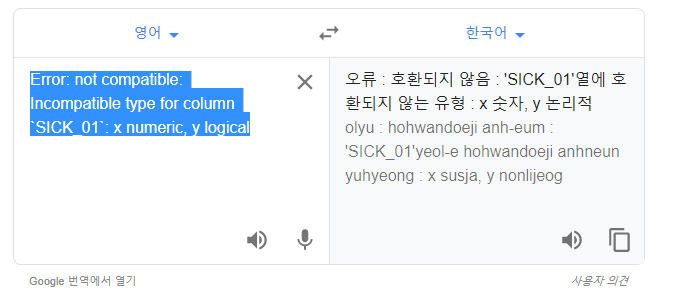위의 함수str()을 이용해서 각 열의 형태를 확인 한 결과 4번째 열의 형태가 에러코드와 같이 x는 숫자, y는 논리였다(위가 y 아래가 x)
